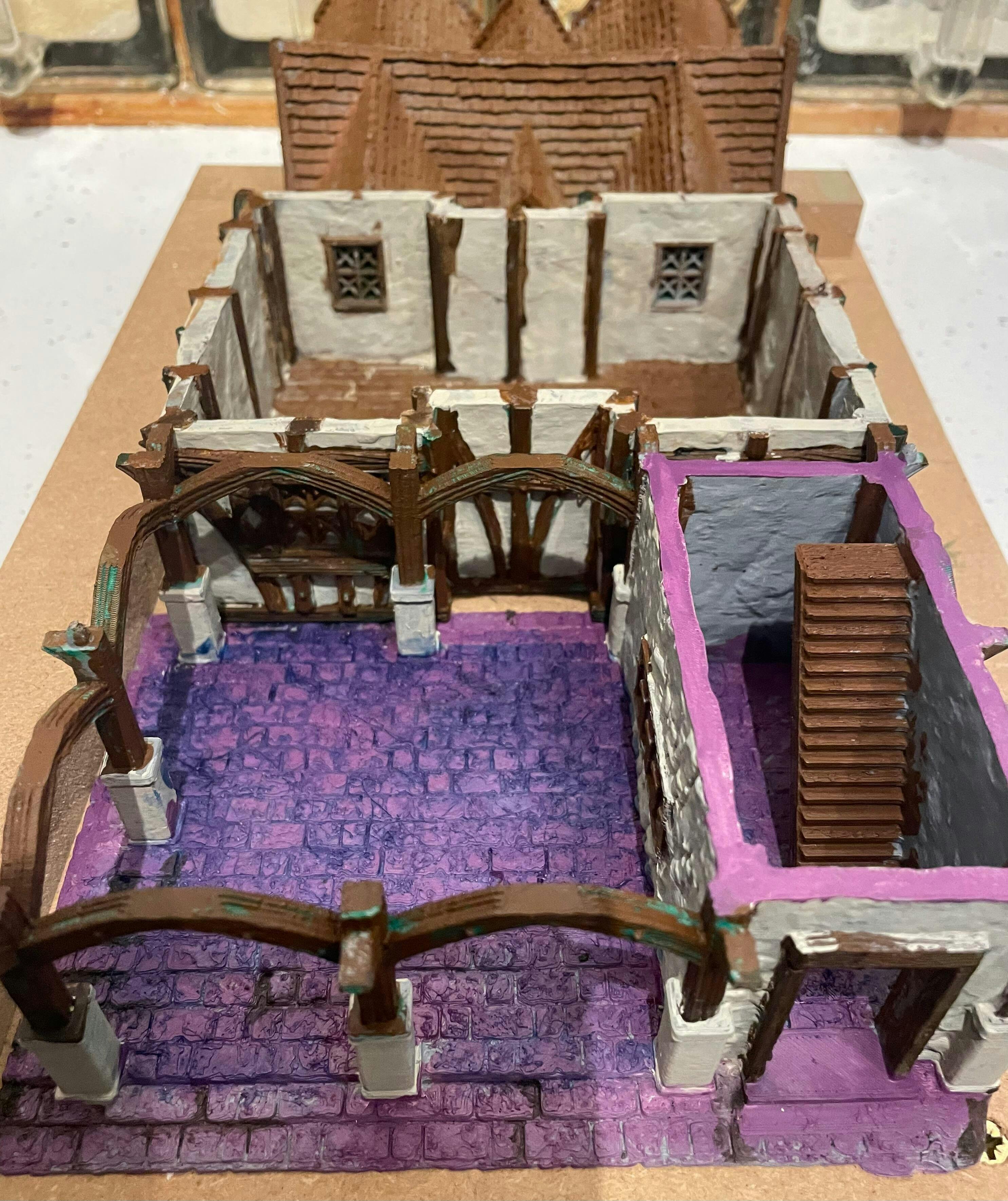 the upper floor walls are similar to the lower, the final layer is the roof, shingle/tiled appearance which paints up decently. all three levels fit together perfectly without any issues. It is my intention to apply magnets to maintain the piece for movement. ie home to show/club. Thoroughly recommend