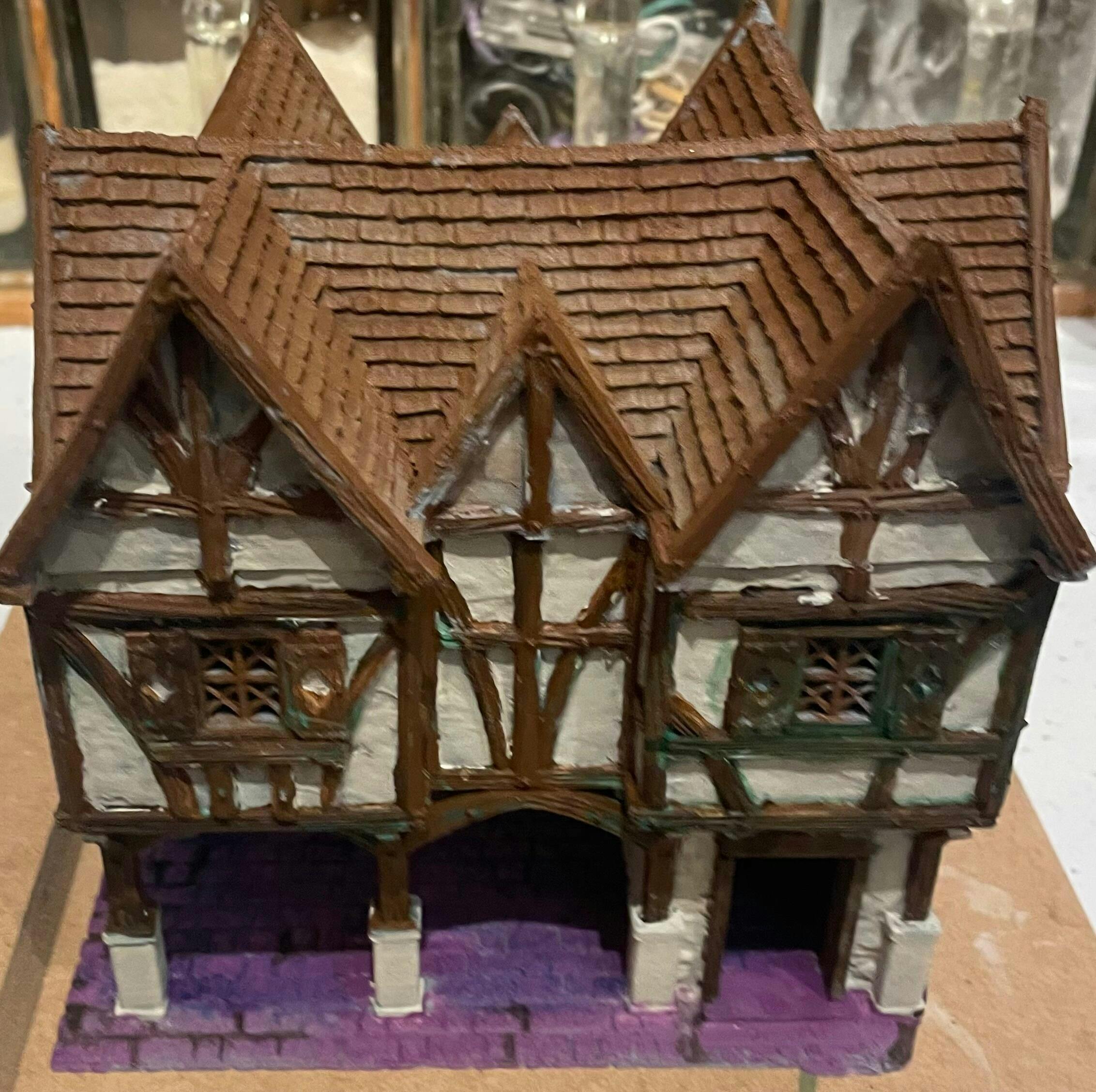 Realistic well cast, detailed inside and outside, a base undercroft area, stone floor, with support beams for the upper floor, this floor had the appropriate hole the aligned with the staircase from the ground, the steps have a wood grain this sots within the blacksmith’s shop. the exterior consists of plaster walls with a few slabs that were crafted for effect, these set between stout beams. As yet I have a door to fit, the windows have framework within the frame,