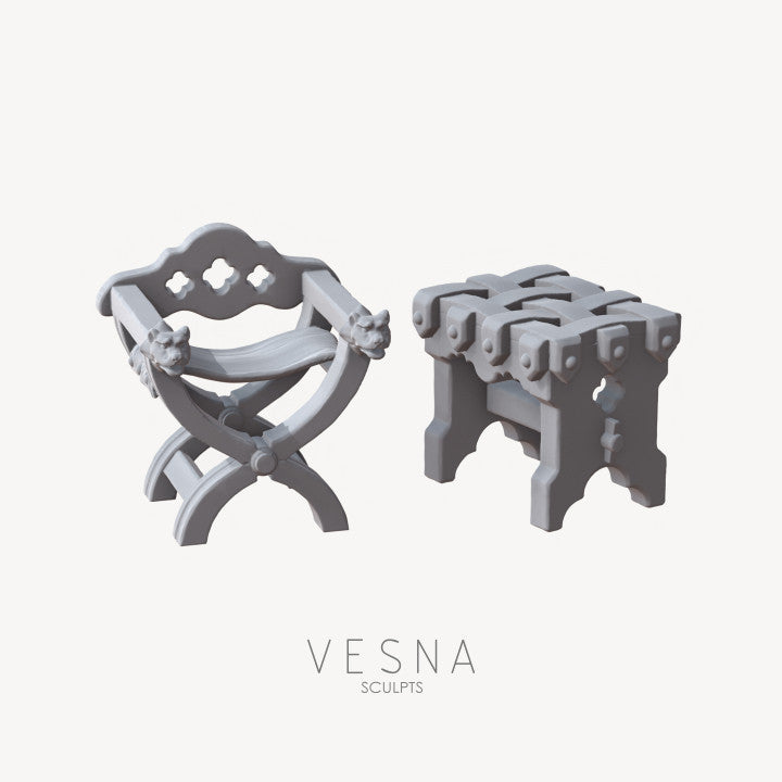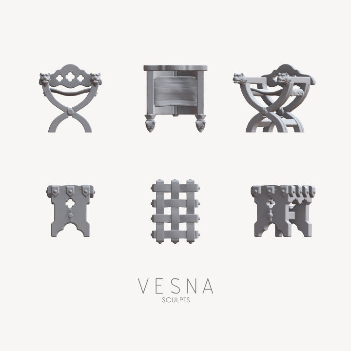 The Medieval Chair and Table Set by Vesna Sculpts is a finely crafted collection that captures the essence of everyday life in medieval times. Each piece is sculpted with meticulous detail, showcasing the sturdy wooden construction, weathered textures, and timeless design that defined the furniture of the era. This set enriches tabletop roleplay, dioramas, and miniature collections by adding atmosphere, realism, and narrative depth to any scene. Whether used to evoke the bustling life of a medieval tavern, the solemnity of a noble hall, or the humble charm of a village dwelling, these chairs and tables serve as versatile additions that inspire imagination. More than simple terrain pieces, they embody cultural heritage and craftsmanship, offering hobbyists and creators a way to bring history and fantasy vividly to life. Vesna Sculpts delivers artistry and thematic depth, transforming miniature settings with furniture that adds character, authenticity, and storytelling potential.